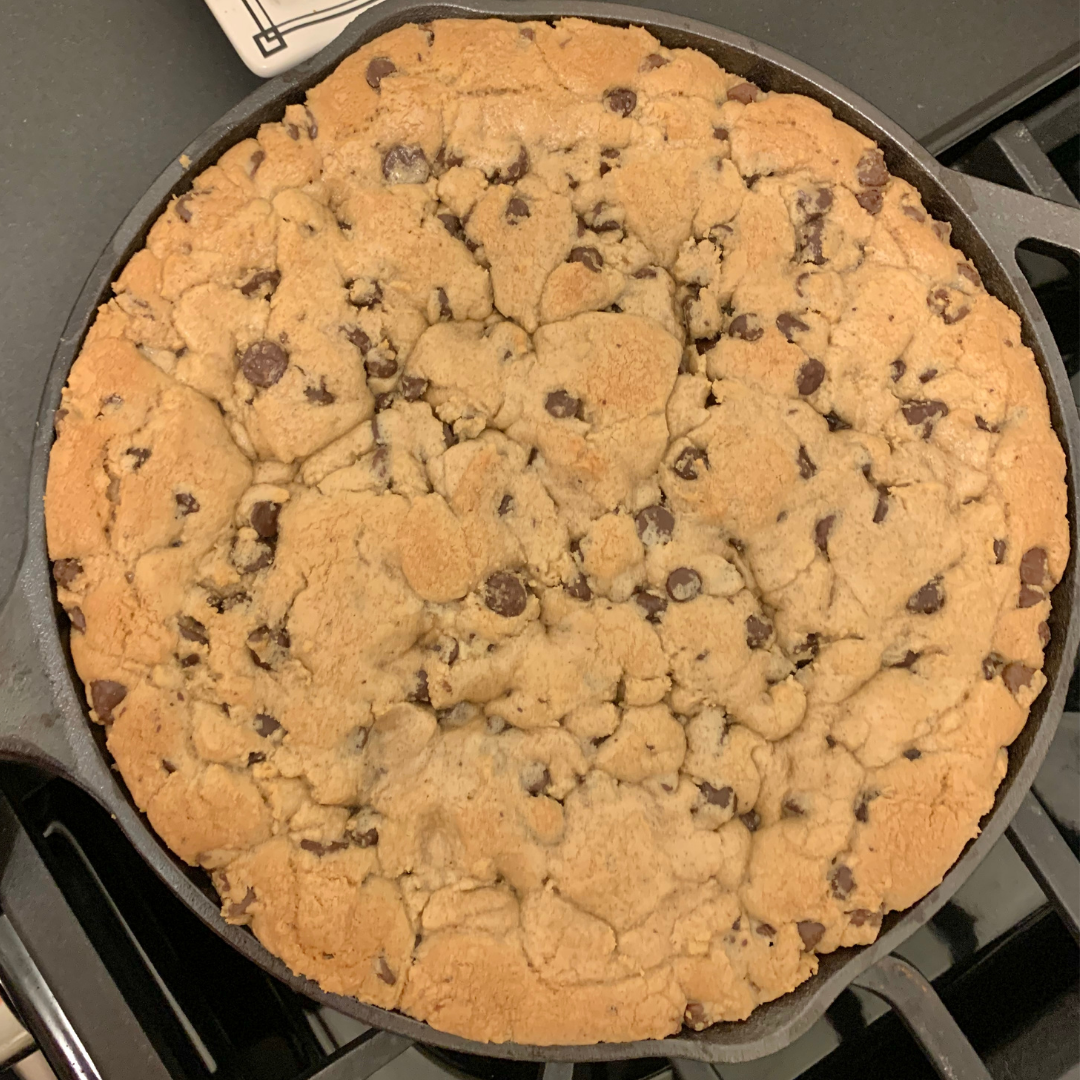 4. Ready to bake! With your oven preheated to 350 — you’re ready to pop this cookie in. Recommended recipes say to bake for 20-minutes until golden brown, we had to bake a little extra (maybe 15-20 minutes) since it hadn’t cooked all the way through. If you cut into your cookie and the dough doesn’t look cooked, pop the skillet back in and keep checking every 5-minutes pending your dough density.